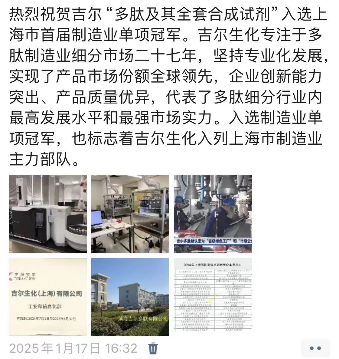 吉尔生化 “多肽试剂” 入选上海首届制造业单项冠军