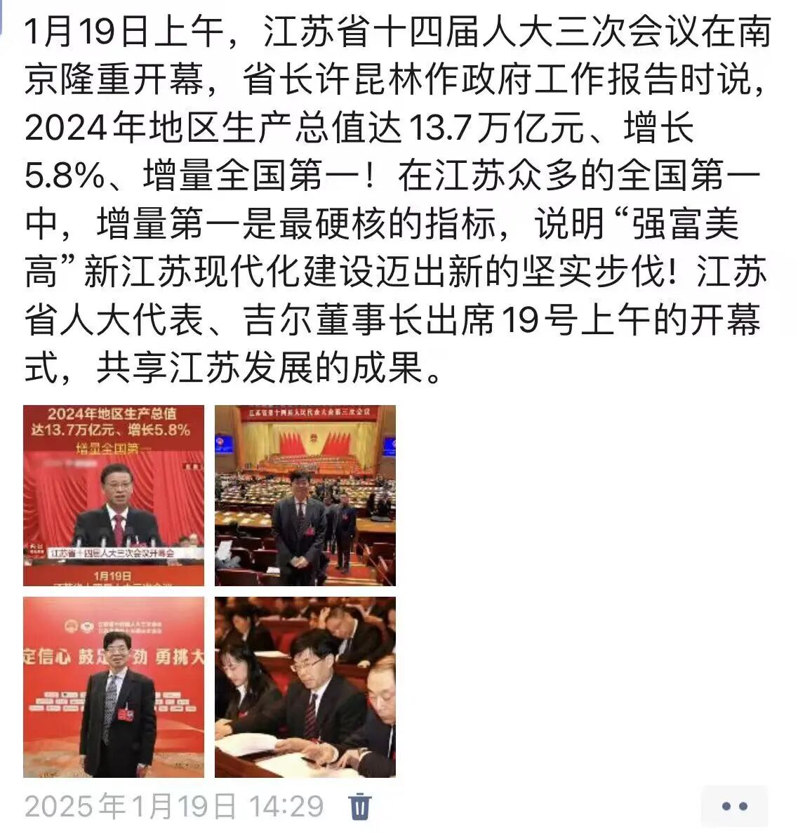 江苏人大开幕:GDP 增 5.8% 增量第一 吉尔董事长共享发展成果