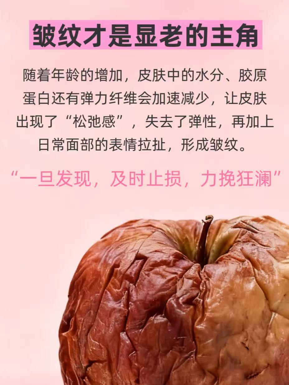 皱纹危机爆发!摆脱皱纹重回“老样子”30+开始皱纹大爆发,从前胶原蛋白满满的脸部,像脱水一般,脸上的纹路就像干裂的地面,[石化R]出现一条条裂缝,一笑就出现,不笑也还在,原来时间带来的不仅是年龄的增长,还是样子的“蜕变”-当皱纹深度还很浅的时候,才是解决它的好时机,日子就像皱纹挖掘机,越挖越深,更加明显-涂抹式抗皱的时代已经过去,微晶抗皱重磅上线,是科技抗皱的新领域也是实现效果、速率的大幅度提升