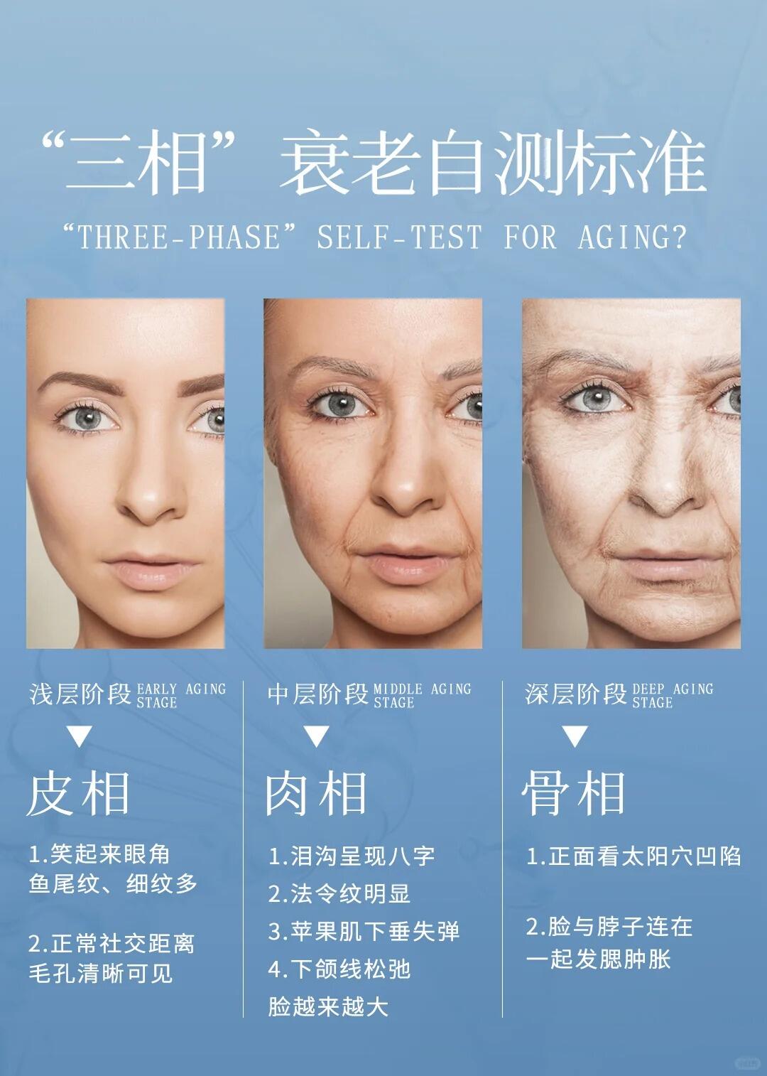1.笑起来眼角鱼尾纹、细纹多2.正常社交距离毛孔清晰可见什么是肉相衰老?1.泪沟呈现八字2.法令纹明显3.苹果肌下垂失弹4.下颌线松弛脸越来越大什么是骨相衰老?1.正面看太阳穴凹陷2.脸与脖子连在一起发腮肿胀···