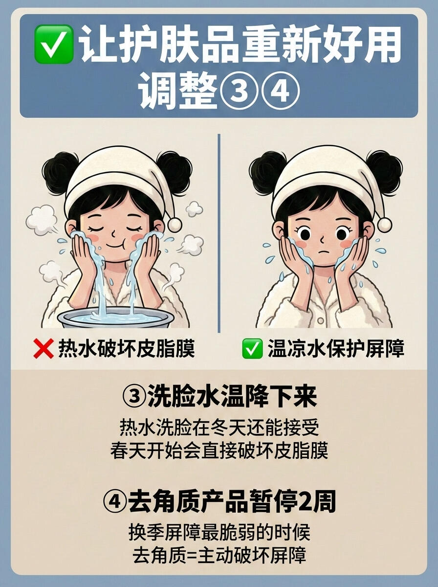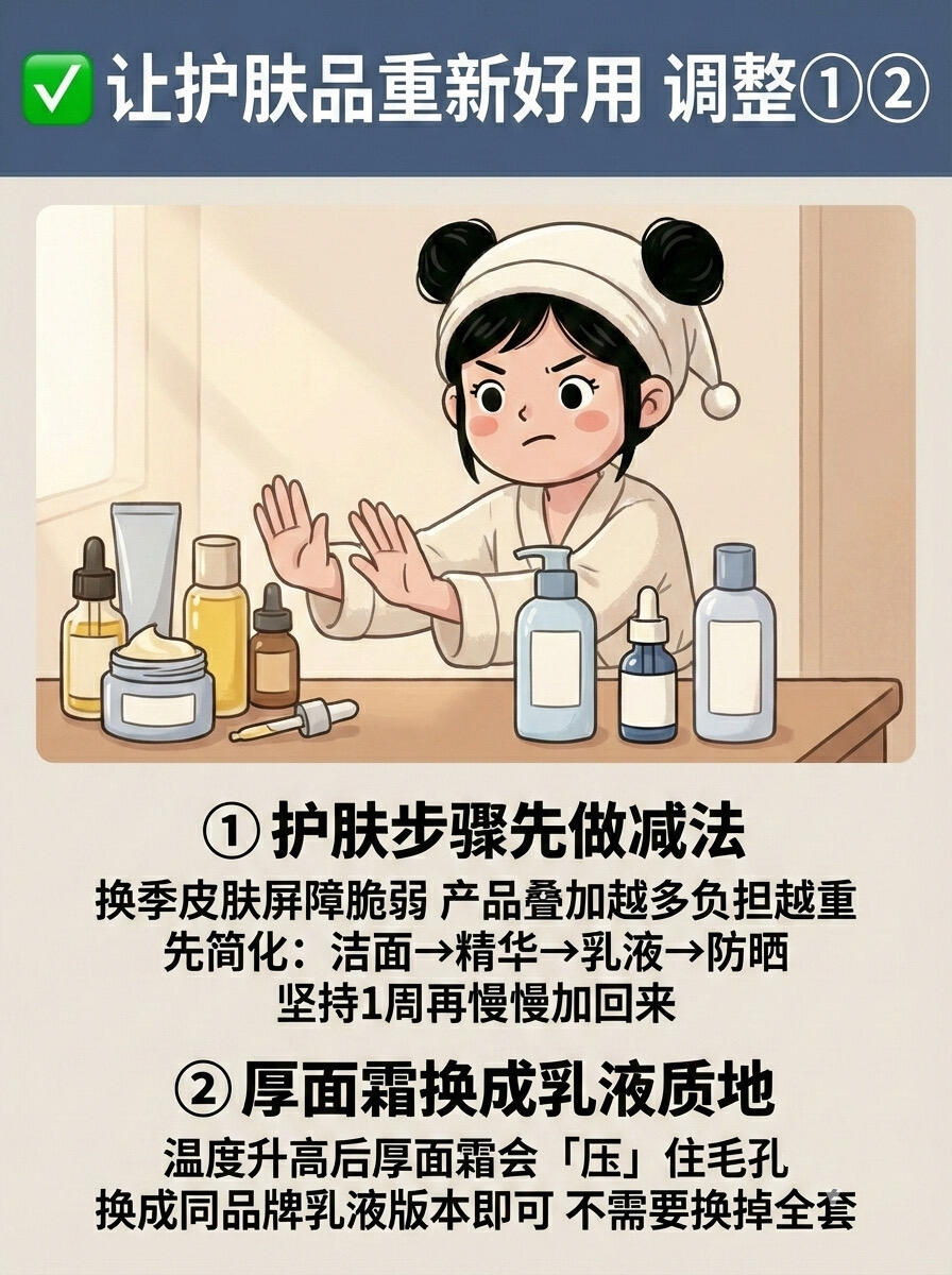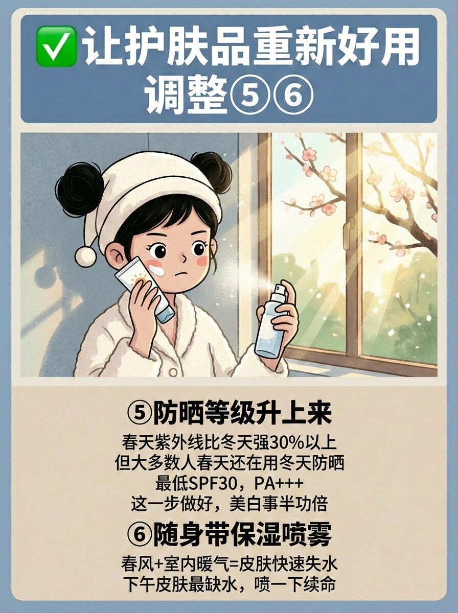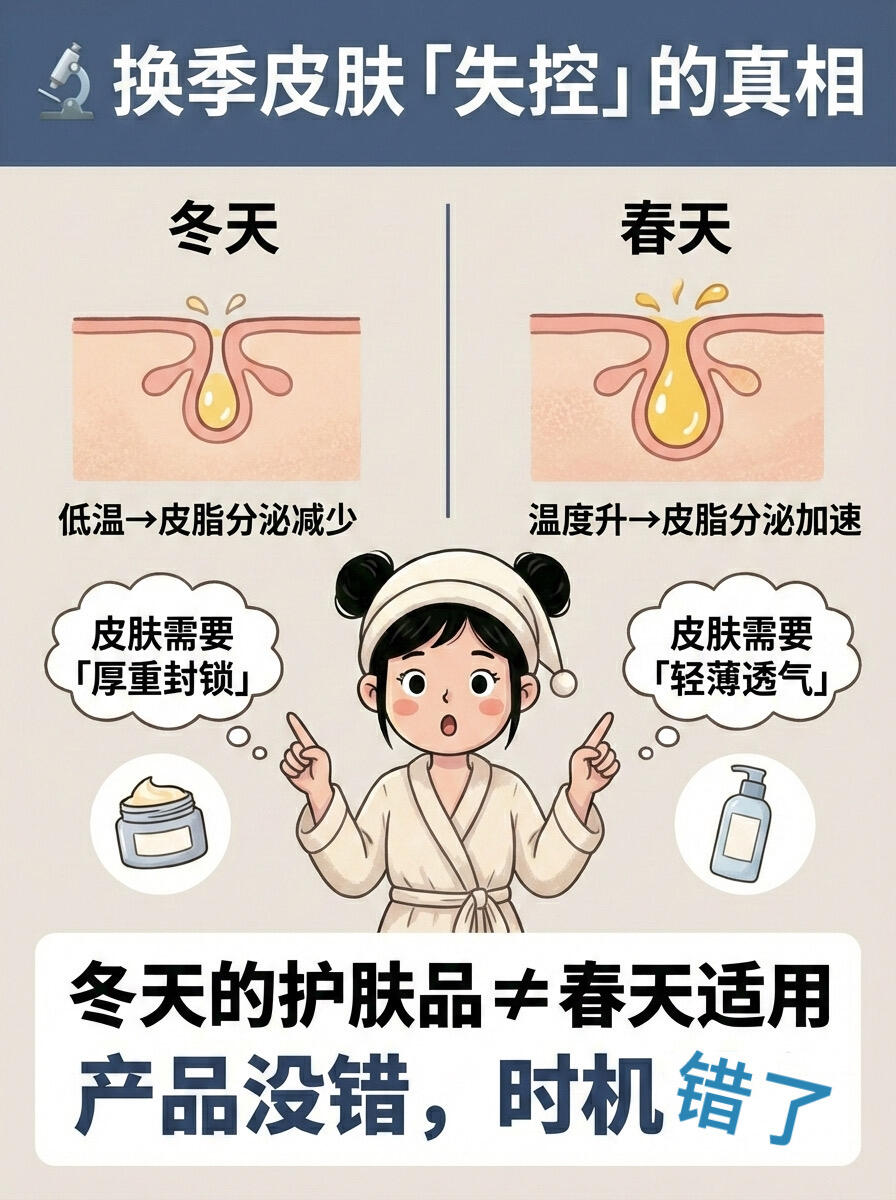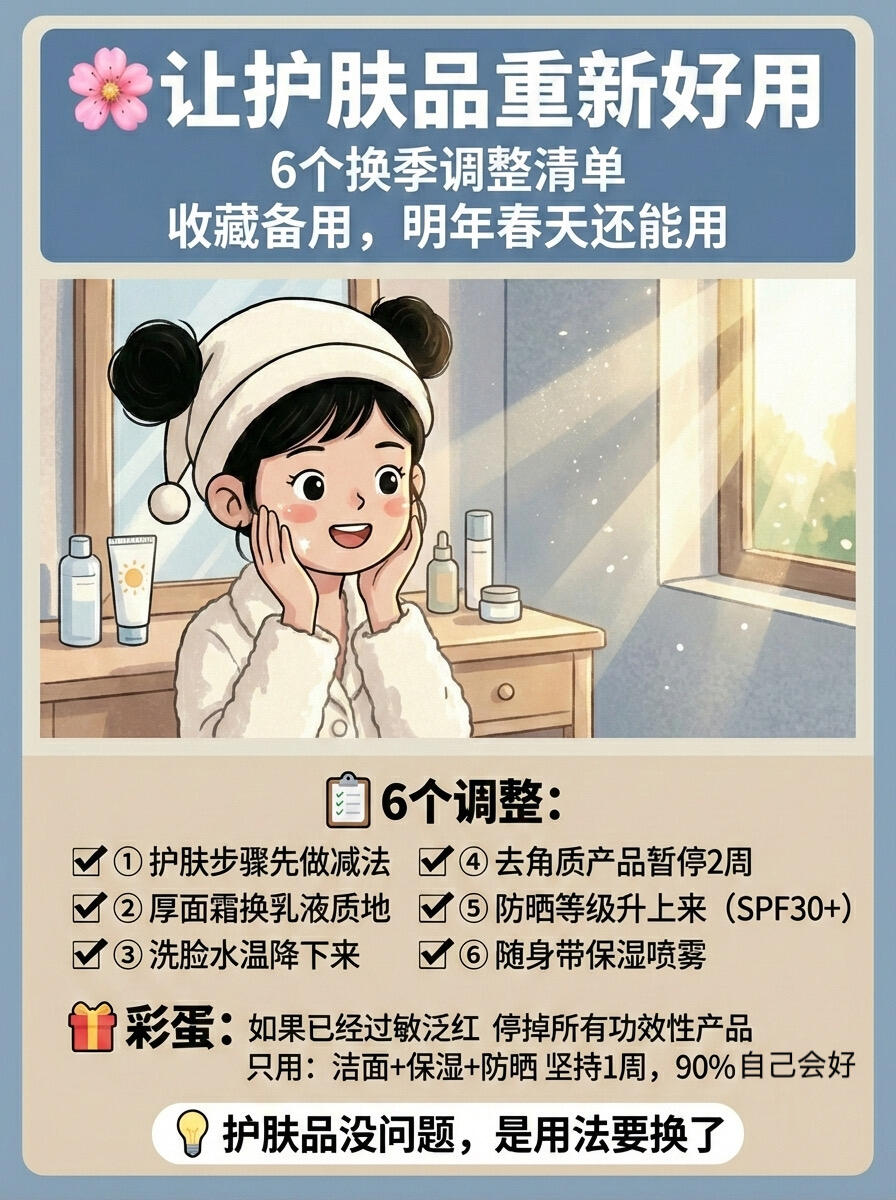 春天皮肤突然变差?不是护肤品的问题🧚♀️||用了一整个冬天的护肤品 春天突然开始「失效」了? 精华吸收变慢 面霜涂上去闷 粉底莫名浮粉 你可能以为是护肤品出问题了 但其实是你的皮肤变了 而你还在用冬天的逻辑护肤 冬天皮肤需要「封锁保湿」 春天皮肤需要「轻薄透气」 这是两套完全不同的逻辑 产品没变,但皮肤的需求变了 6个换季调整 让护肤品重新「好用」起来 🌸